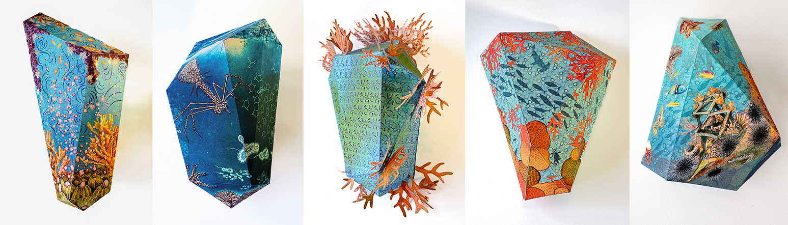 A skilled and imaginative printmaker with imagery often addressing the issue of coral reef decline, Kolijn excels at lino and woodcut to describe undersea life with detail, pattern and formal design. Having left Curaçao in 1978, she returned in 1995 to visit her parents, now retired on the island. Here she made the shocking discovery that the coral reef was in decline. “The sea urchins had disappeared, and the hallmark forests of elkhorn coral as well.” She notes that in the 30 years she has been returning, the coral reefs have continued to deteriorate.